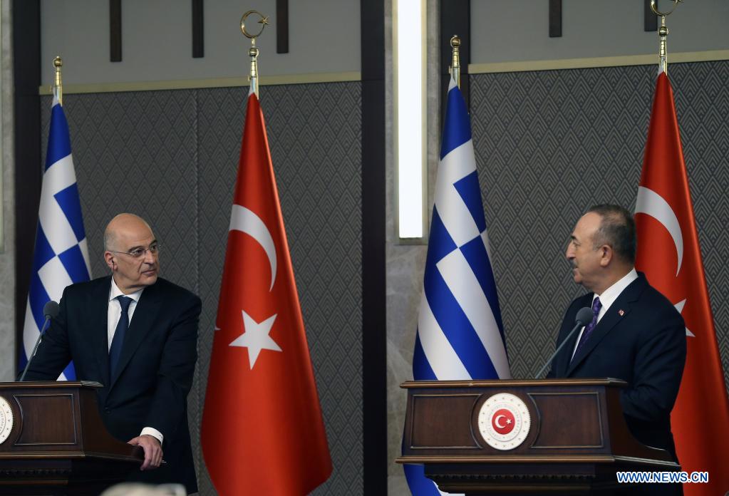 Turkish Foreign Minister Mevlut Cavusoglu (R) and Greek Foreign Minister Nikos Dendias attend a joint press conference in Ankara, Turkey, on April 15, 2021. Turkey believes that its issues with Greece can be resolved through constructive dialogue between the two neighbors and allies, Turkish Foreign Minister Mevlut Cavusoglu said Thursday. (Photo by Mustafa Kaya/Xinhua)