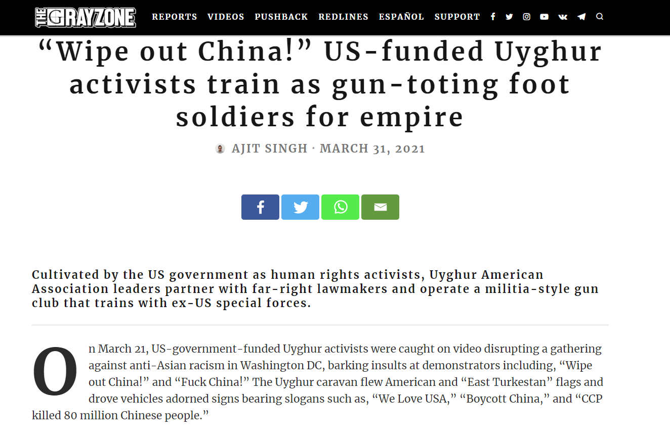On March 21, US-government-funded Uyghur activists were caught on video disrupting a gathering held in Washington DC against anti-Asian racism, a move which drew widespread condemnation on social media, wrote Ajit Singh in an article entitled "'Wipe out China!' US-funded Uyghur activists train as gun-toting foot soldiers for empire" as published in The Grayzone on March 31.