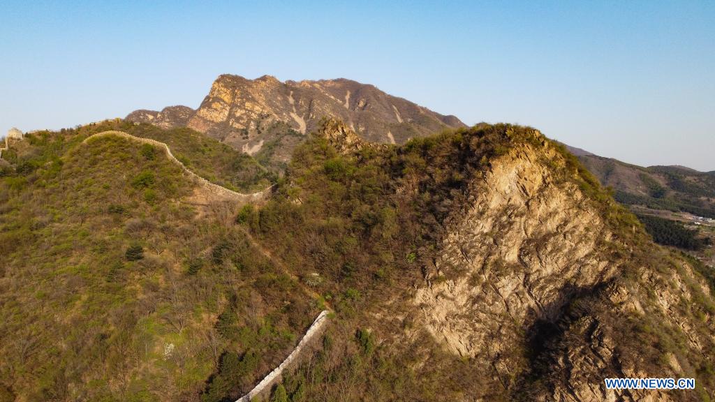Aerial photo taken on April 14, 2021 shows the spring scenery of the Great Wall at the Huangya Pass in Tianjin, north China. In recent years, more and more Chinese people living in cities prefer to go to the countryside for leisure and relaxation, which facilitates the development of rural tourism. Huangyaguan village, at the foot of the Great Wall of Huangya Pass in Tianjin, has benefited from this trend. (Photo by Sun Fanyue/Xinhua)
