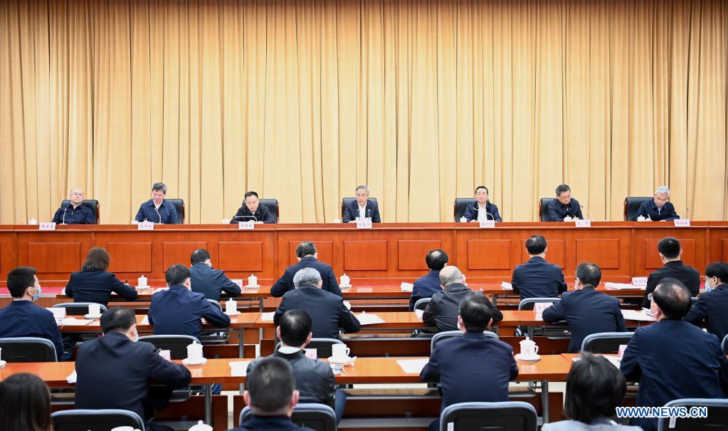 Chinese Vice Premier Hu Chunhua, also a member of the Political Bureau of the Communist Party of China Central Committee, attends a teleconference on agricultural production in the spring, in Beijing, capital of China, April 16, 2021. (Xinhua/Li Xiang)