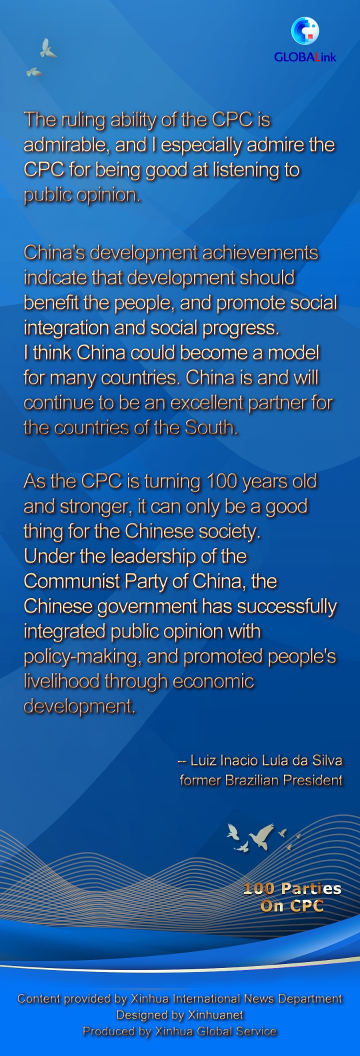 "Under the leadership of the Communist Party of China, the Chinese government has successfully integrated public opinion with policy-making, and promoted people's livelihood through economic development," Lula, also founder of Brazil's Workers' Party (PT), told Xinhua in a recent interview.