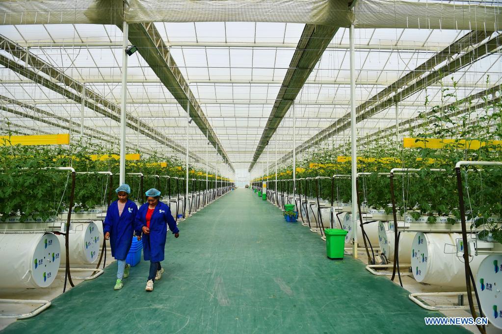 Two workers walk inside a smart greenhouse of a modern vegetable industrial park in Shule County, Kashgar, northwest China's Xinjiang Uygur Autonomous Region, on April 17, 2021. The modern vegetable industrial park, built with assistance from east China's Shandong Province, covers a combined area of 4,711 mu (about 314 hectares) with a planned total investment of 1.06 billion yuan (about 162.6 million U.S. dollars). The first-phase project, which comprises 70,000-square meter smart greenhouses, a 4,000-square meter breeding center and 200 daylight greenhouses, is already in operation. When fully completed, the park is expected to annually yield 1.5 million tons of fresh vegetables, 1 million tons of which will be processed inside the park, along with 3,000 stable job opportunities. (Xinhua/Hou Zhaokang)