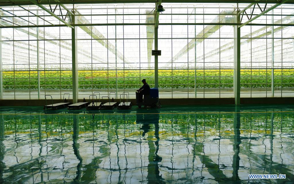 A sanitation worker operates inside a smart greenhouse of a modern vegetable industrial park in Shule County, Kashgar, northwest China's Xinjiang Uygur Autonomous Region, on April 17, 2021. The modern vegetable industrial park, built with assistance from east China's Shandong Province, covers a combined area of 4,711 mu (about 314 hectares) with a planned total investment of 1.06 billion yuan (about 162.6 million U.S. dollars). The first-phase project, which comprises 70,000-square meter smart greenhouses, a 4,000-square meter breeding center and 200 daylight greenhouses, is already in operation. When fully completed, the park is expected to annually yield 1.5 million tons of fresh vegetables, 1 million tons of which will be processed inside the park, along with 3,000 stable job opportunities. (Xinhua/Hou Zhaokang)