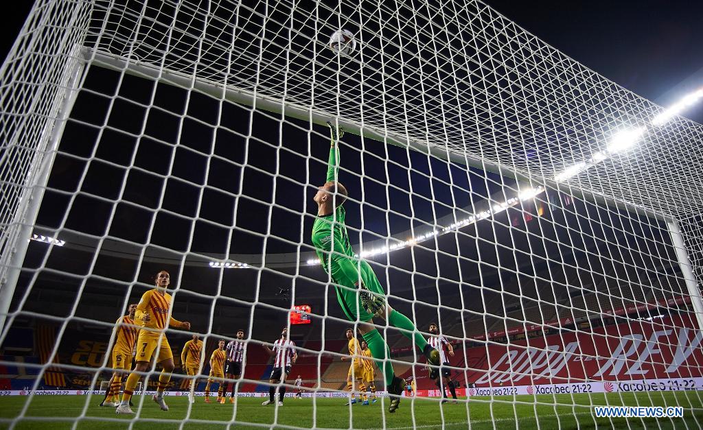 Marc-Andre ter Stegen (front) of FC Barcelona makes a save during the 2020-21 season Spanish King's Cup final match between Athletic Bilbao and FC Barcelona in Seville, Spain, on April 17, 2021. (Photo by Pablo Morano/Xinhua)