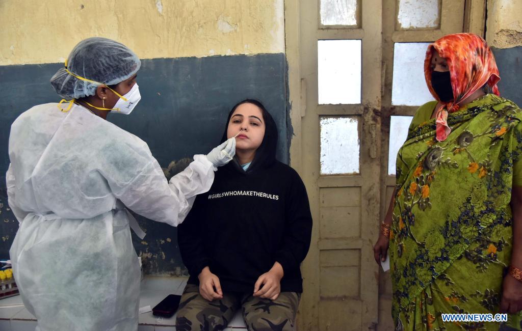 A health worker in protective gear takes a nasal swab sample from a woman during a routine COVID-19 test at a hospital in Hyderabad, capital of India's southern state of Telangana on April 16, 2021. (Str/Xinhua)