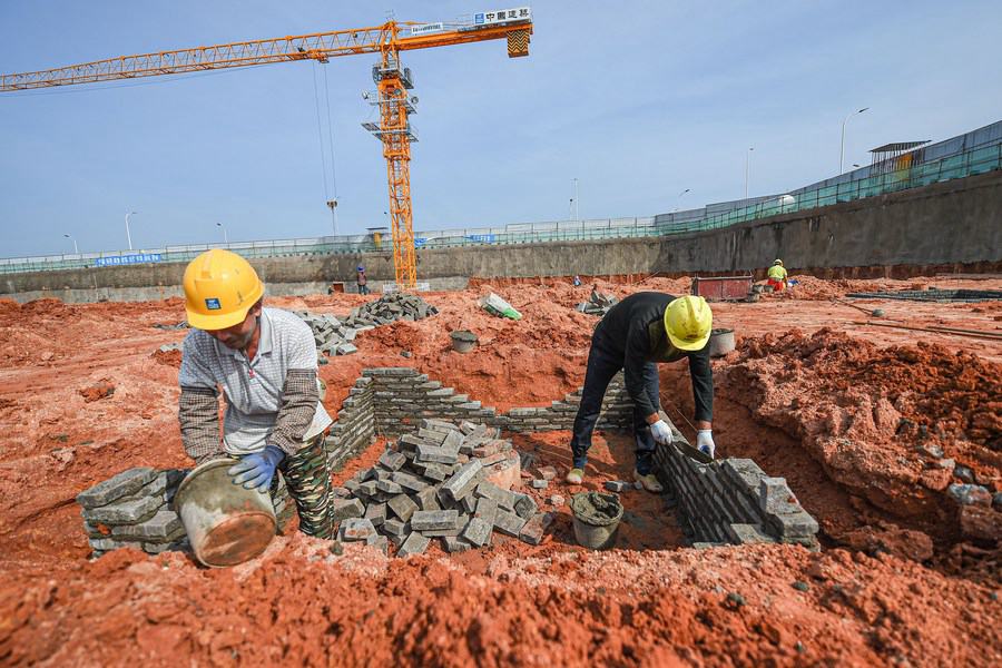 People work at the construction site of the West-coast Internet Headquarters Base in Haikou, south China's Hainan Province, Oct. 21, 2020. (Xinhua/Pu Xiaoxu)