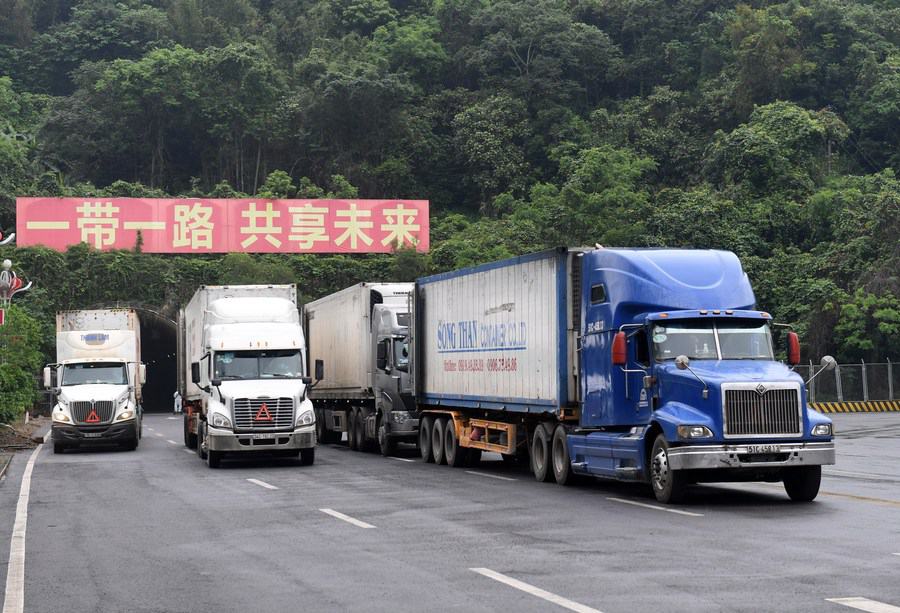 Trucks run at Youyiguan border gate in Pingxiang City, south China's Guangxi Zhuang Autonomous Region, April 13, 2020. (Xinhua/Lu Boan)