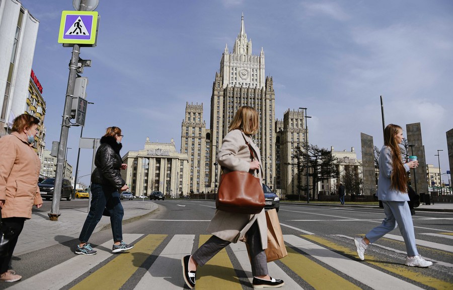 People cross the road in front of the Ministry of Foreign Affairs of Russia in Moscow, on April 16, 2021. (Xinhua/Evgeny Sinitsyn)