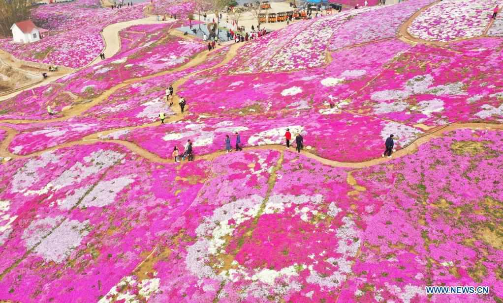 Aerial photo taken on April 18, 2021 shows moss pink flowers in full bloom on the bank of the Daheiting reservoir in Qianxi County, Tangshan, north China's Hebei Province. (Xinhua/Yang Shiyao)