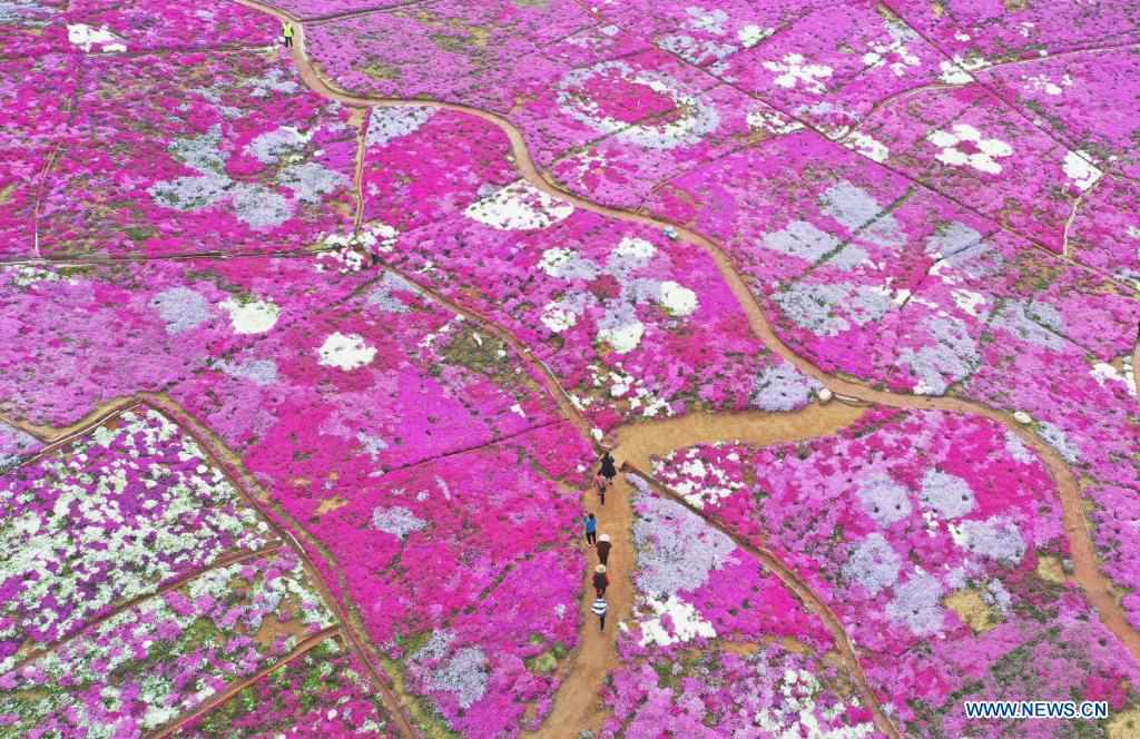Aerial photo taken on April 18, 2021 shows moss pink flowers in full bloom on the bank of the Daheiting reservoir in Qianxi County, Tangshan, north China's Hebei Province. (Xinhua/Yang Shiyao)