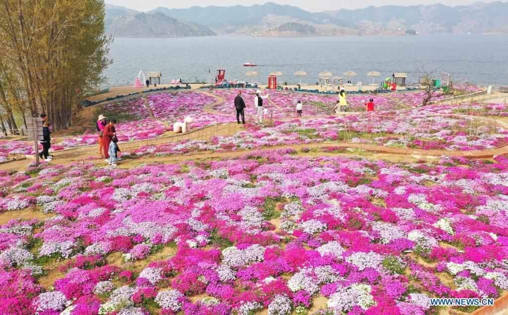Aerial photo taken on April 18, 2021 shows moss pink flowers in full bloom on the bank of the Daheiting reservoir in Qianxi County, Tangshan, north China's Hebei Province. (Xinhua/Yang Shiyao)