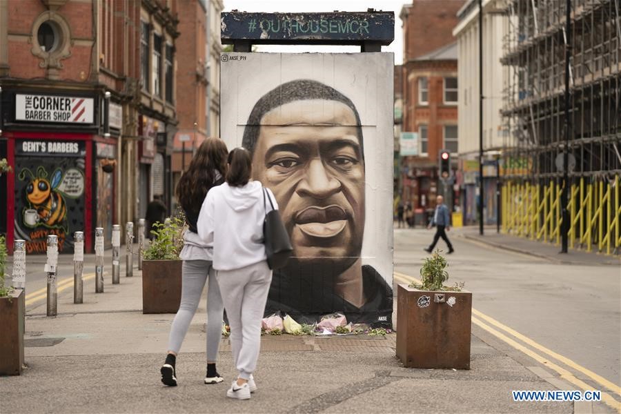 People are seen standing in front of a mural of George Floyd, who was suffocated to death while under police custody in the mid-western US state of Minnesota, in central Manchester, the UK, on June 4, 2020. (Photo by Jon Super/Xinhua)