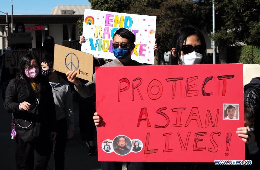People take part in a rally against anti-Asian hate crimes in San Mateo, California, the United States, on Feb. 27, 2021. Senior officials of the US Justice Department said on Friday that week that the recent surge in violence and hate-related incidents against Asian Americans in the country is unacceptable, vowing to investigate these cases and other hate crimes. (Xinhua/Wu Xiaoling)