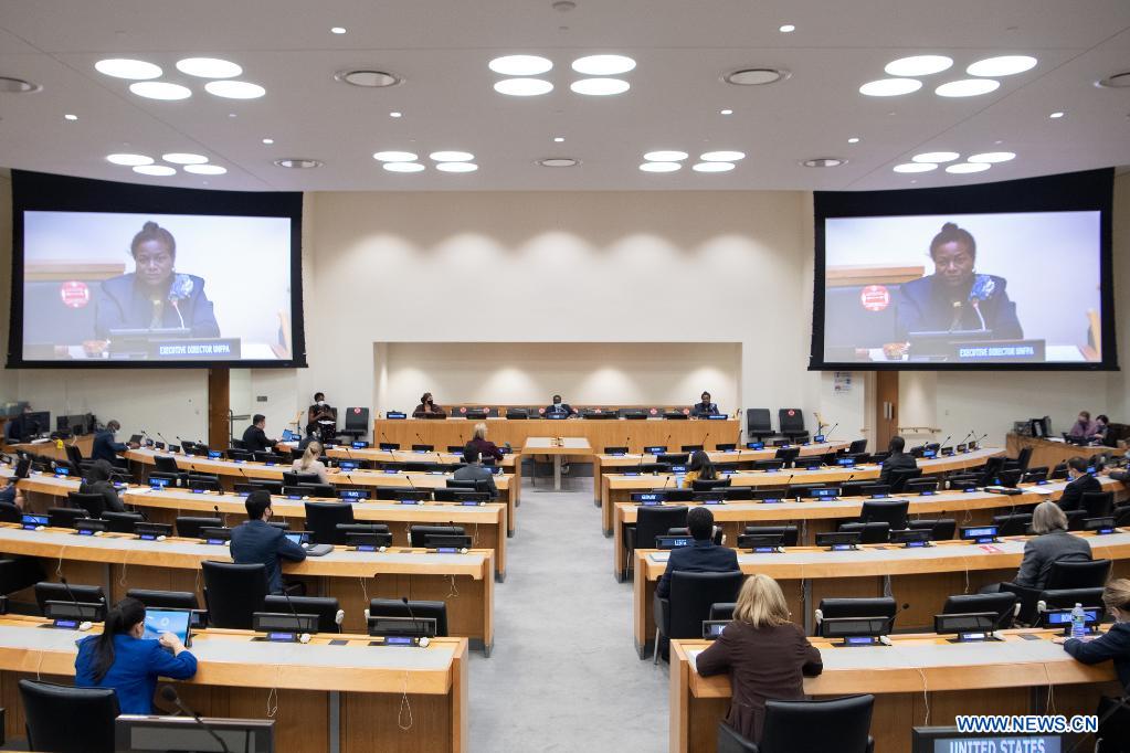 Photo taken on April 19, 2021 shows the scene of the 54th session of the UN Commission on Population and Development at the UN headquarters in New York. The United Nations has called for urgent action to feed the world's growing population healthily, equitably and sustainably, according to messages and statistics revealed Monday from this year's meeting of the UN Commission on Population and Development. (Eskinder Debebe/UN Photo/Handout via Xinhua)