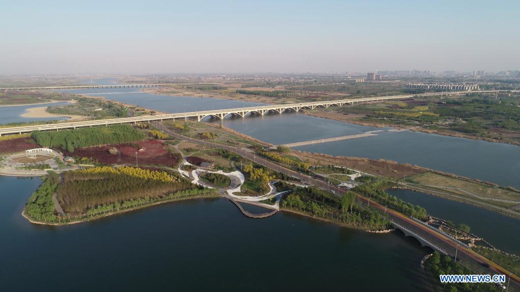 Aerial photo taken on April 13, 2021 shows a section of the Hutuo River in Shijiazhuang, north China's Hebei Province. The water quality and ecosystem in the Hutuo River have been improved thanks to the ecological restoration efforts. (Xinhua/Yang Shiyao)