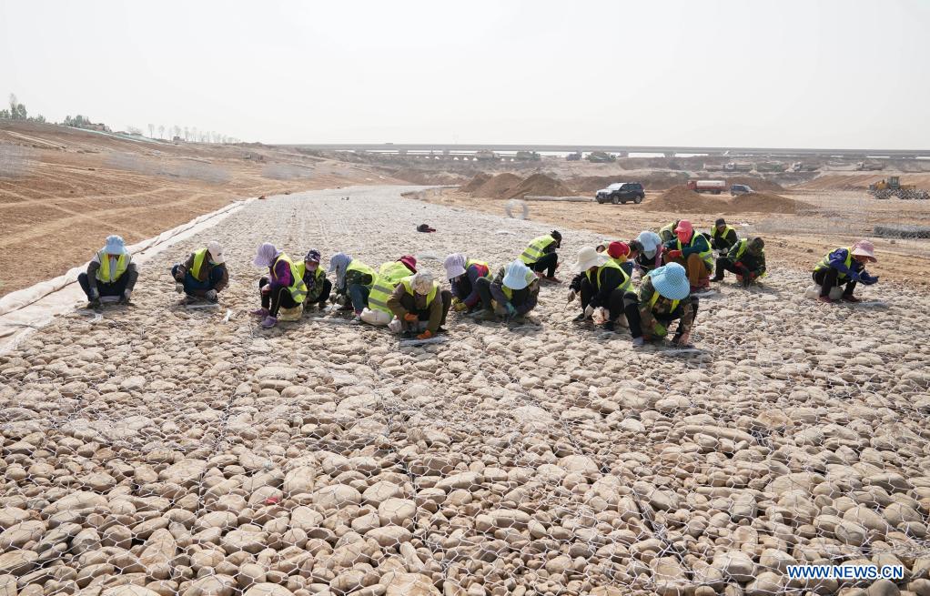 Photo taken on April 19, 2021 shows workers at the construction site of Hutuo River restoration project phase III in Shijiazhuang, north China's Hebei Province. The water quality and ecosystem in the Hutuo River have been improved thanks to the ecological restoration efforts. (Xinhua/Yang Shiyao)