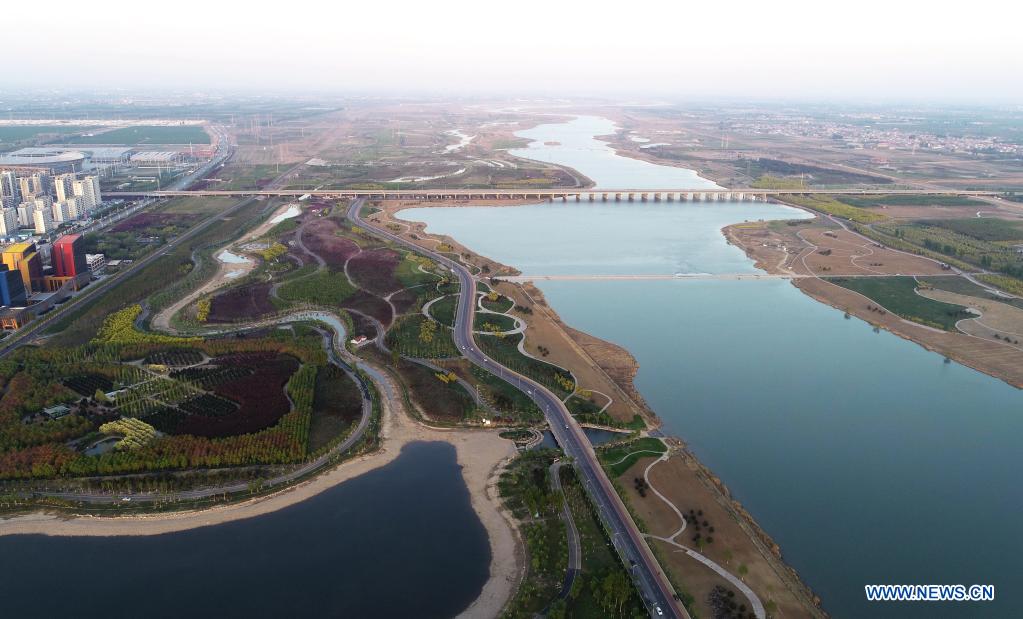Aerial photo taken on April 13, 2021 shows the scenery of Hutuo River in Shijiazhuang, north China's Hebei Province. The water quality and ecosystem in the Hutuo River have been improved thanks to the ecological restoration efforts. (Xinhua/Yang Shiyao)