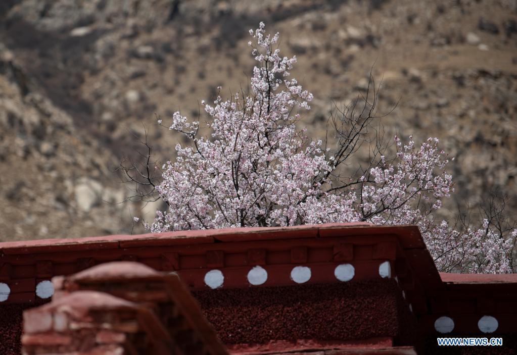 Peach blossoms are seen near the Pabonka Hermitage in the northern suburb of Lhasa, southwest China's Tibet Autonomous Region, April 18, 2021. (Xinhua/Chogo)