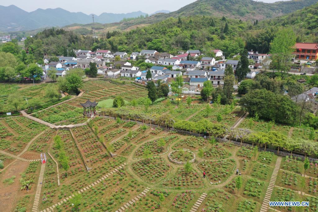 Aerial photo taken on April 15, 2021 shows a peony garden in the Fenghuangshan scenic area in Tongling City, east China's Anhui Province. Tree peony, a long-lived deciduous woody shrub native to China, has many hidden economic potentials under its gorgeous appearance. Tree peony planting, which has a history of more than 1,600 years at Fenghuang Mountain in Tongling City, east China's Anhui Province, has become a new driving force for this city's economic development. (Photo by Zhan Jun/Xinhua)