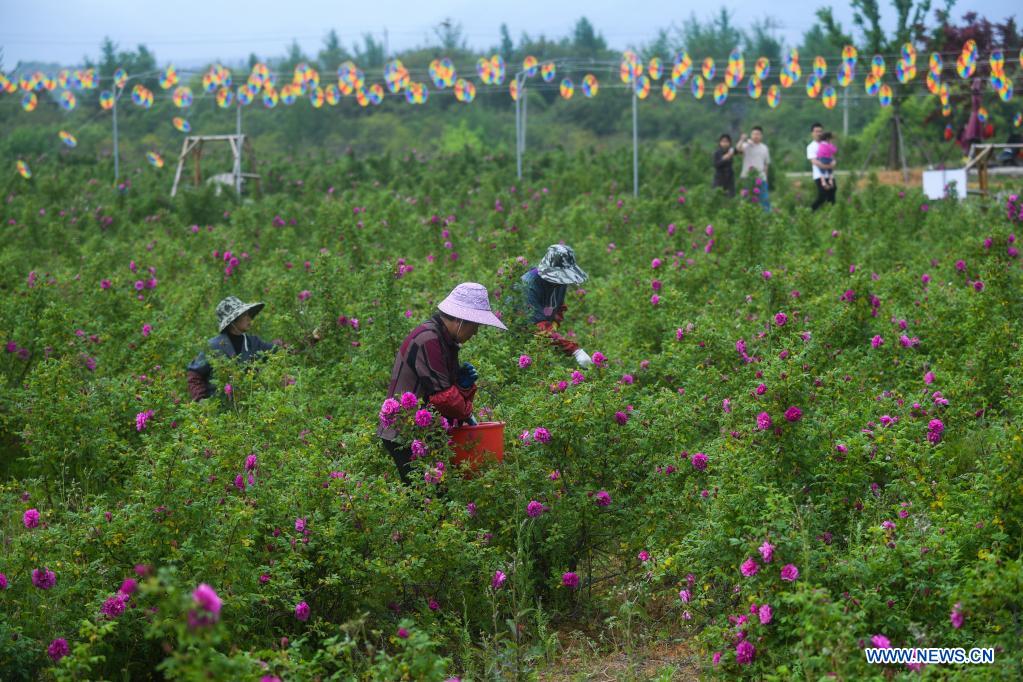 Farmers pick roses at a planting base in Shigugang Village of Changxing County, east China's Zhejiang Province, April 20, 2021. Flowers in planting bases are in full bloom as temperature rises recently in Changxing, attracting tourists and boosting local economic development. (Xinhua/Xu Yu)