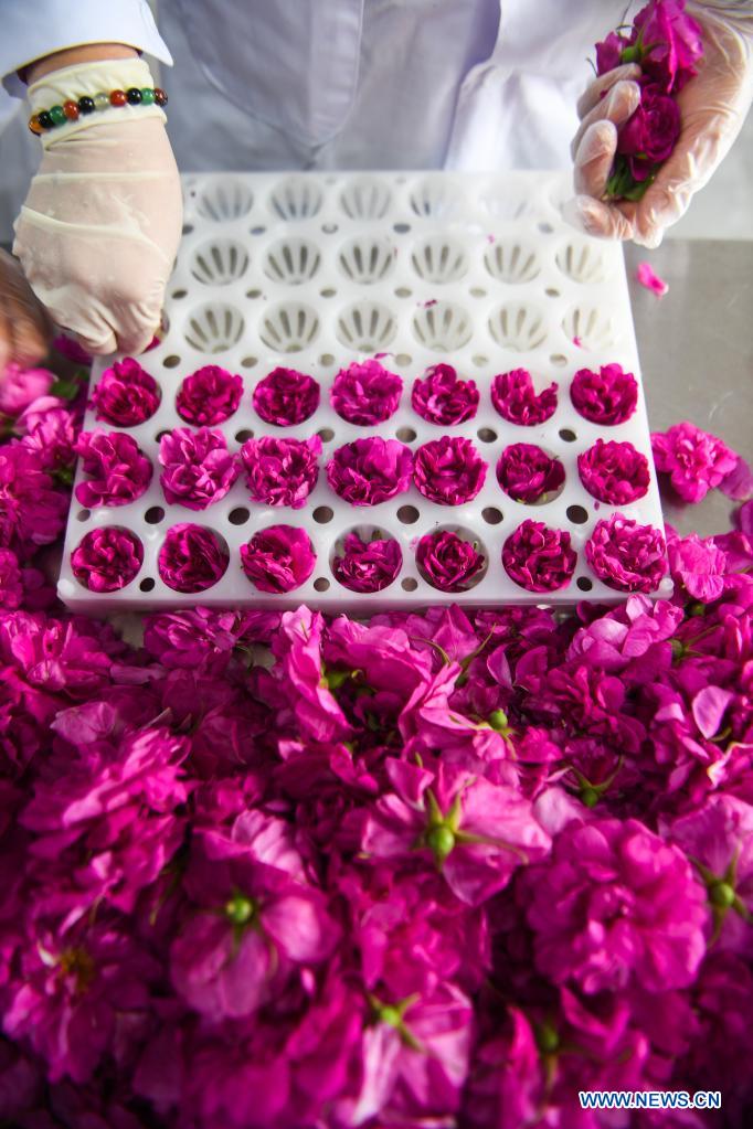 A farmer arranges picked roses at a planting base in Shigugang Village of Changxing County, east China's Zhejiang Province, April 20, 2021. Flowers in planting bases are in full bloom as temperature rises recently in Changxing, attracting tourists and boosting local economic development. (Xinhua/Xu Yu)
