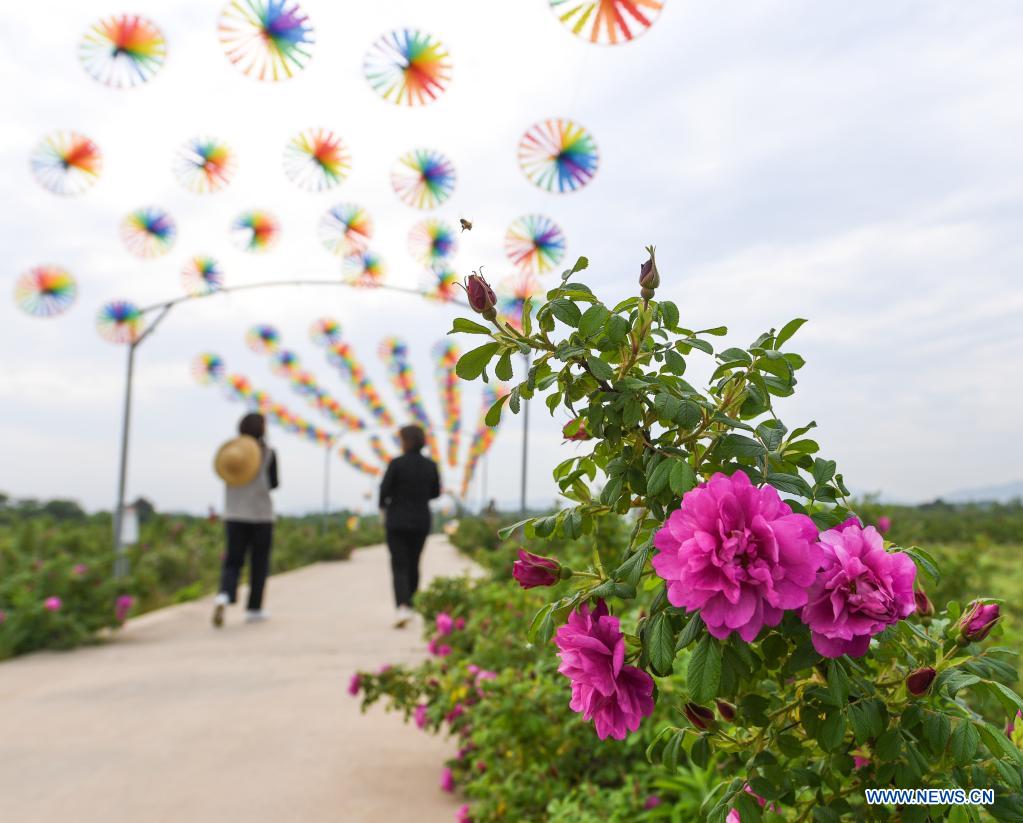Tourists visit a rose planting base in Shigugang Village of Changxing County, east China's Zhejiang Province, April 20, 2021. Flowers in planting bases are in full bloom as temperature rises recently in Changxing, attracting tourists and boosting local economic development. (Xinhua/Xu Yu)