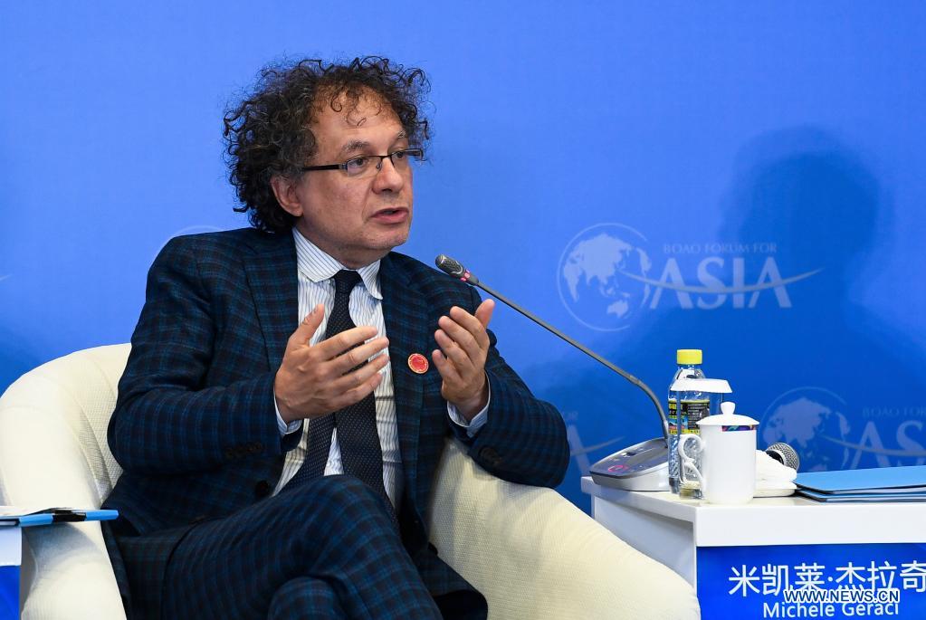 Michele Geraci, former Under-Secretary of State for the Italian Ministry of Economic Development, speaks at a sub-forum themed "Free Trade Ports: The Global Trend" during Boao Forum for Asia annual conference in Boao, south China's Hainan Province, April 20, 2021. (Xinhua/Yang Guanyu)