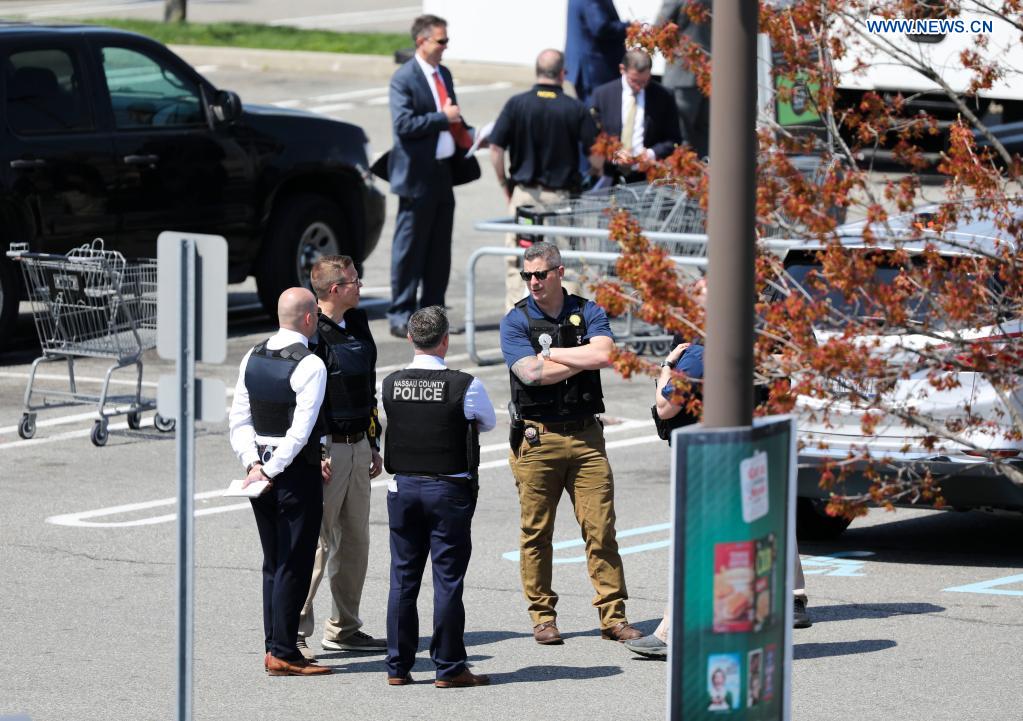 Police officers gather outside a Stop &Shop grocery store where a shooting took place in West Hempstead, New York, the United States, on April 20, 2021. A suspect in a shooting at the suburban New York grocery store on Tuesday was arrested after remaining at large for hours, local police said. The shooting, leaving one dead and two others injured, occurred late morning Tuesday at an office of the Stop &Shop grocery store in West Hempstead, according to police. (Xinhua/Wang Ying)
