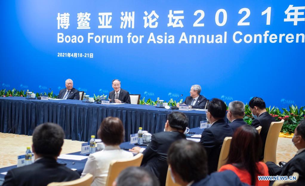 Chinese Vice President Wang Qishan attends the Boao Forum for Asia (BFA) Annual Conference 2021 opening ceremony in Boao, south China's Hainan Province, April 20, 2021. Wang met with members of the BFA board of directors and the forum's strategic partners, and exchanged views with representatives from the business circle. (Xinhua/Li Tao)