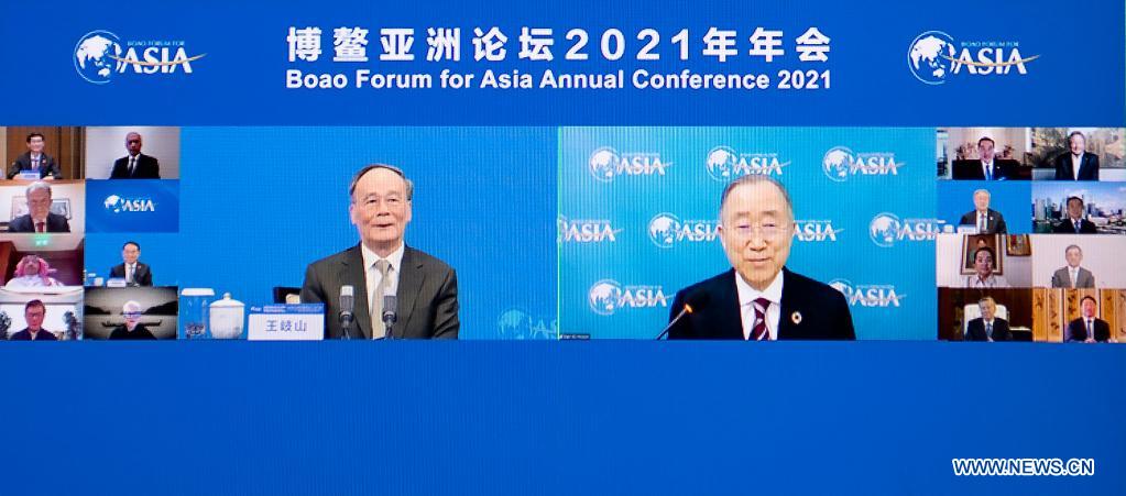 Chinese Vice President Wang Qishan attends the Boao Forum for Asia (BFA) Annual Conference 2021 opening ceremony in Boao, south China's Hainan Province, April 20, 2021. Wang met with members of the BFA board of directors and the forum's strategic partners, and exchanged views with representatives from the business circle. (Xinhua/Li Tao)