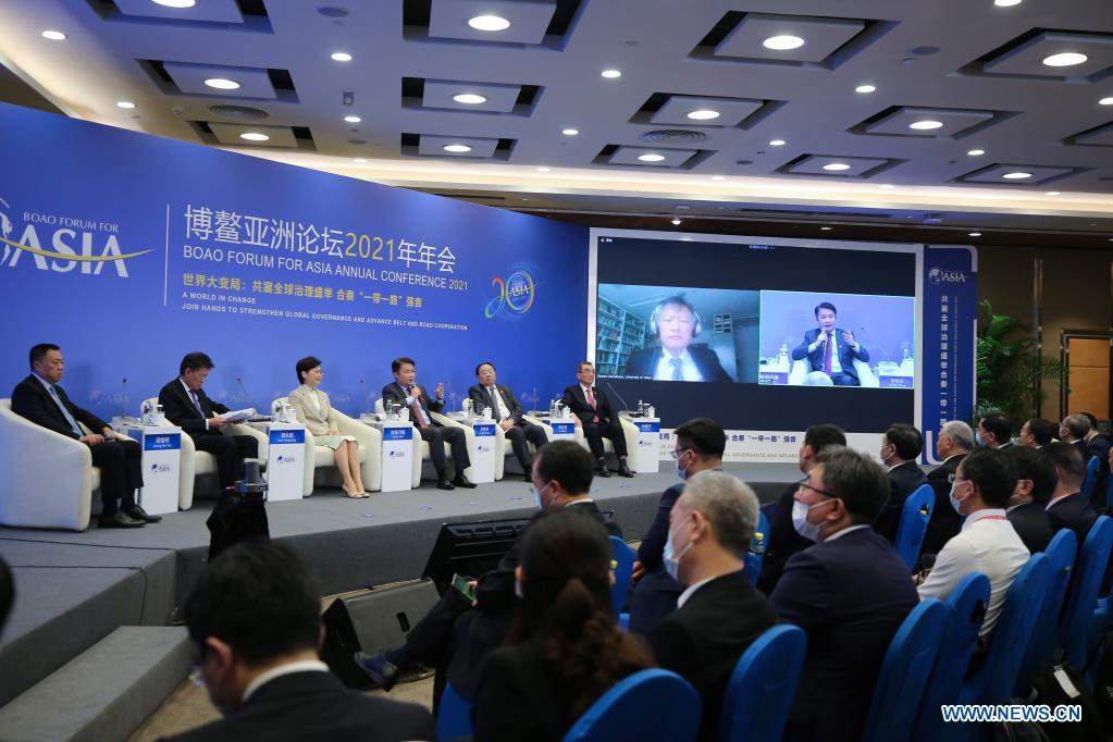 Photo taken on April 20, 2021 shows a view of a sub-forum "Invigorate Development through Vibrant City Clusters: The Guangdong-Hong Kong-Macao Greater Bay Area as a Model" during Boao Forum for Asia annual conference in Boao, south China's Hainan Province. (Xinhua/Zhang Liyun)