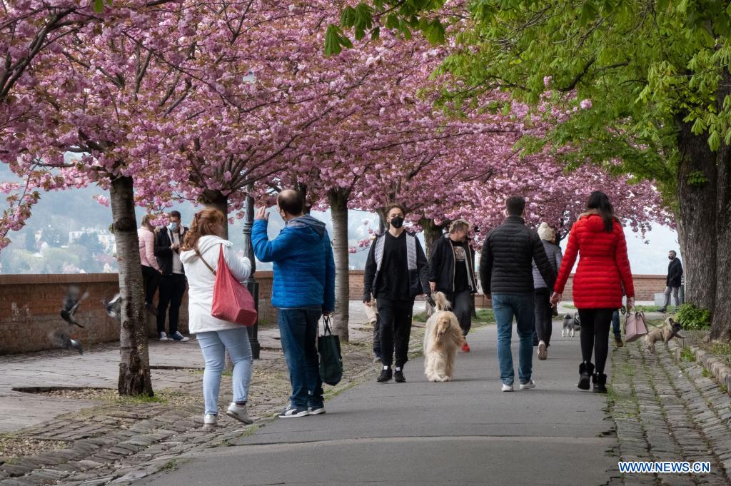 People walk under cherry blossom in the Castle of Buda in Budapest, Hungary on April 19, 2021. (Photo by Attila Volgyi/Xinhua)