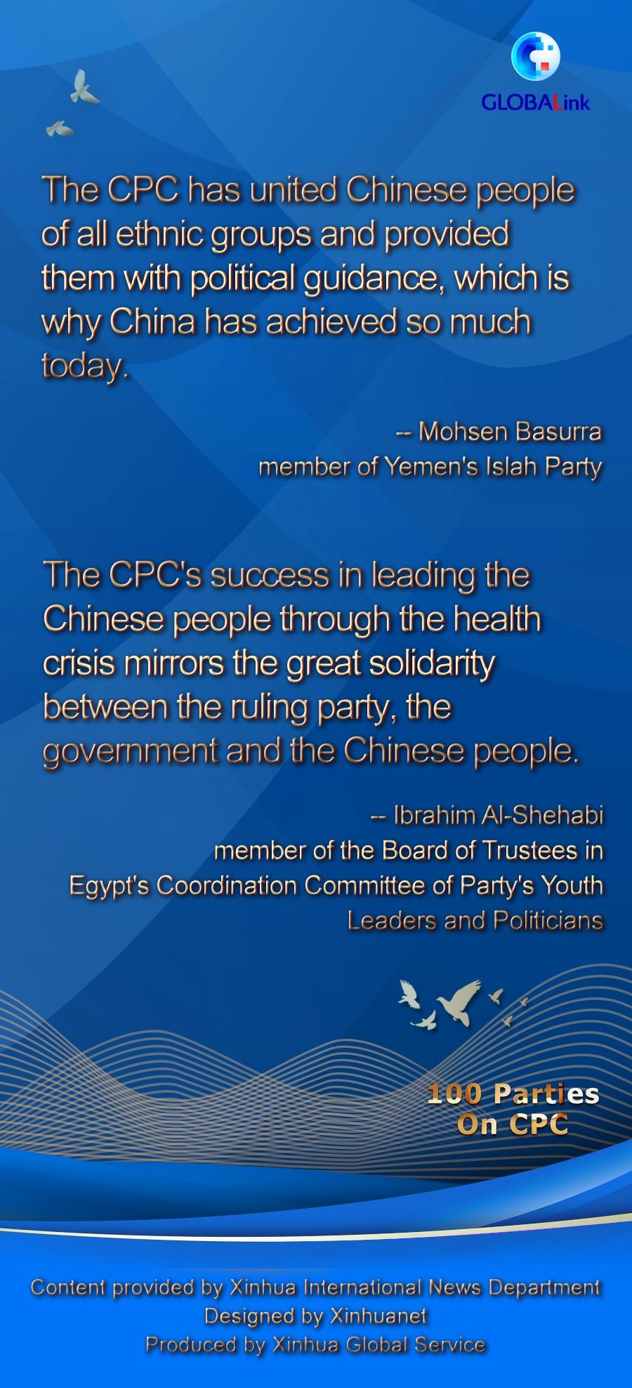 In a recent video interview with Xinhua, Mohsen Basurra, member of Yemen's Islah Party, said that the CPC has united Chinese people of all ethnic groups and provided them with political guidance, which is why China has achieved so much today.