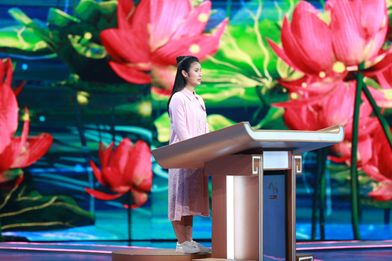 Photo shows Wu You, a post-millennial girl with visual impairment from Chengdu, southwest China's Sichuan province on stage for the TV show Chinese Poetry Competition. (Photo credit to Chengdu Special Education School)