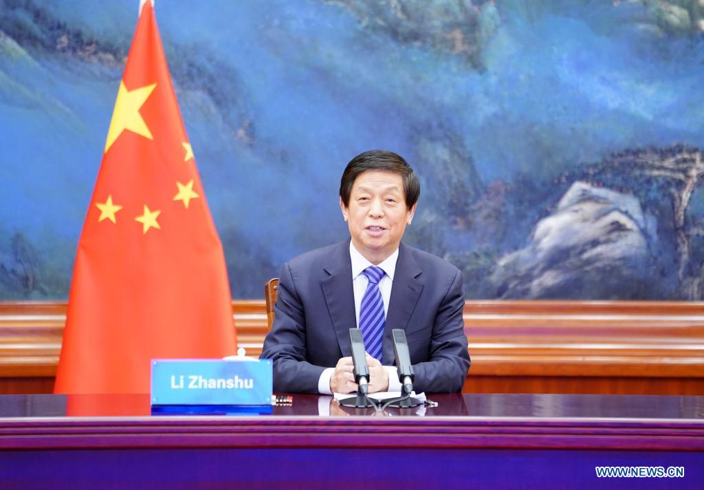BEIJING, April 21 (Xinhua) -- China's top legislator Li Zhanshu on Tuesday held talks with Egyptian House of Representatives Speaker Hanafy Ali al-Gebaly via video link, pledging to consistently develop bilateral relations.