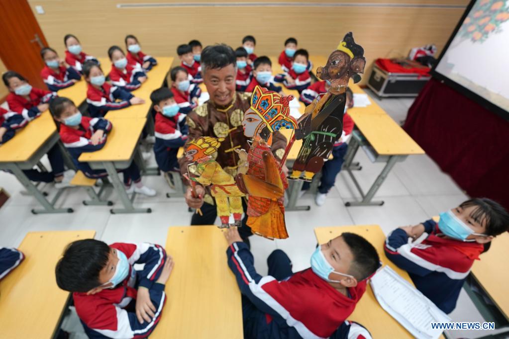 An artist shows shadow puppets to students at the No. 6 Middle School in Shahe City, north China's Hebei Province, April 21, 2021. The middle school has invited local artists to introduce the traditional shadow play to students as a part of effort to have its students better know intangible culture heritage. (Xinhua/Luo Xuefeng)