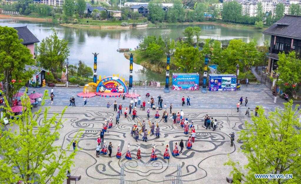 Aerial photo taken on April 21, 2021 shows people perform traditional Chinese music and dance at the Danzhai Wanda Town in Danzhai County, Qiandongnan Miao and Dong Autonomous Prefecture, southwest China's Guizhou Province. (Photo by Fan Hui/Xinhua)