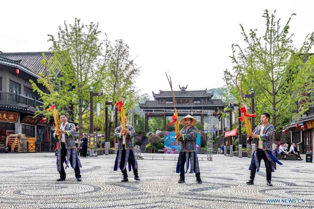 People perform traditional Chinese music and dance at the Danzhai Wanda Town in Danzhai County, Qiandongnan Miao and Dong Autonomous Prefecture, southwest China's Guizhou Province, April 21, 2021. (Photo by Fan Hui/Xinhua)