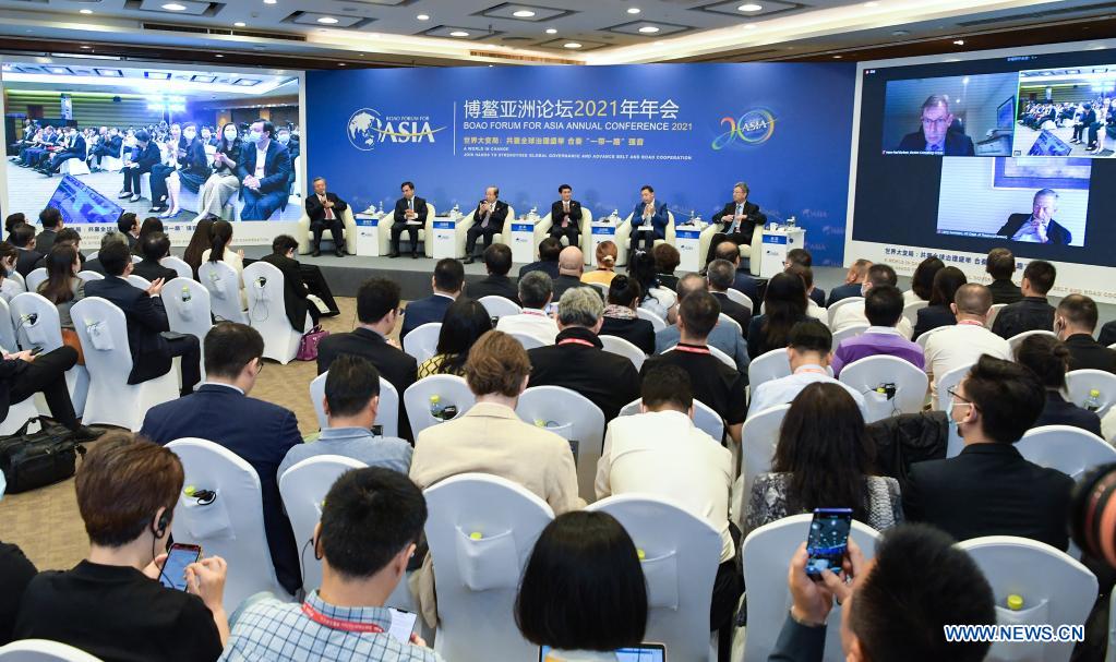 Guests attend a sub-forum themed "Dual Circulation - China's New Growth Paradigm" during Boao Forum for Asia (BFA) annual conference in Boao, south China's Hainan Province, April 21, 2021. A sub-forum themed "Dual Circulation - China's New Growth Paradigm" was held in Boao on Wednesday. (Xinhua/Li He)