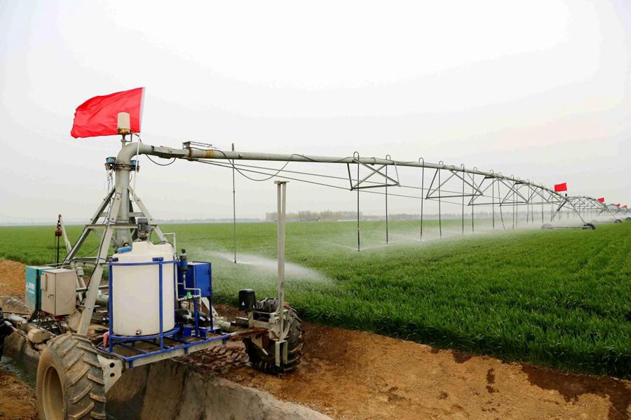 Photo taken on April 11, 2021, shows a 500-meter-long self-propelled truss sprinkler irrigating a wheat field in Lique township, Guangrao county, east China’s Shandong province. (People’s Daily Online/Zhou Guangxue)