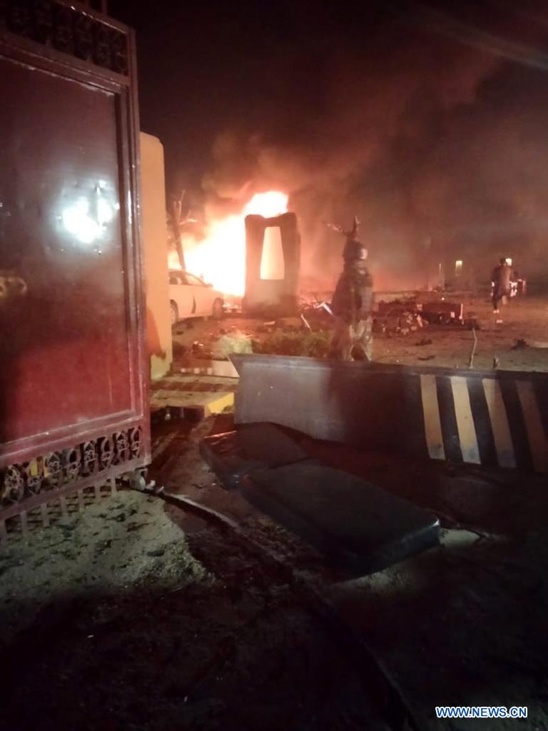 Fire breaks out at the blast site in Quetta, Pakistan's southwest Balochistan province, on April 21, 2021. Three people were killed and 11 others injured when a bomb went off inside the parking area of Serena hotel in Balochistan province Wednesday night, hospital sources said. (Str/Xinhua)