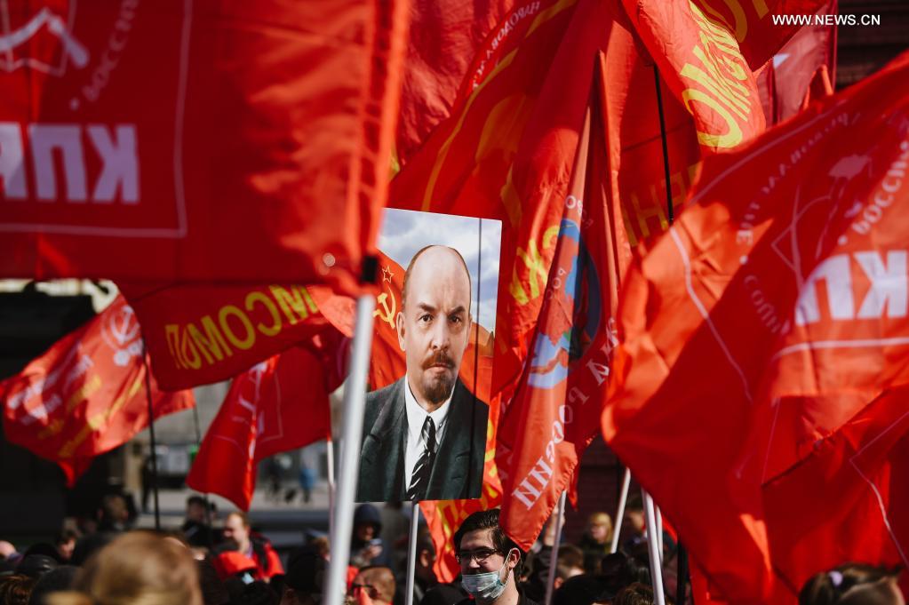 Photo taken on April 22, 2021 shows a portrait of Vladimir Lenin during a flower laying ceremony at Lenin's mausoleum to mark the 151st anniversary of the revolutionary leader's birth in Moscow, Russia. (Xinhua/Evgeny Sinitsyny)