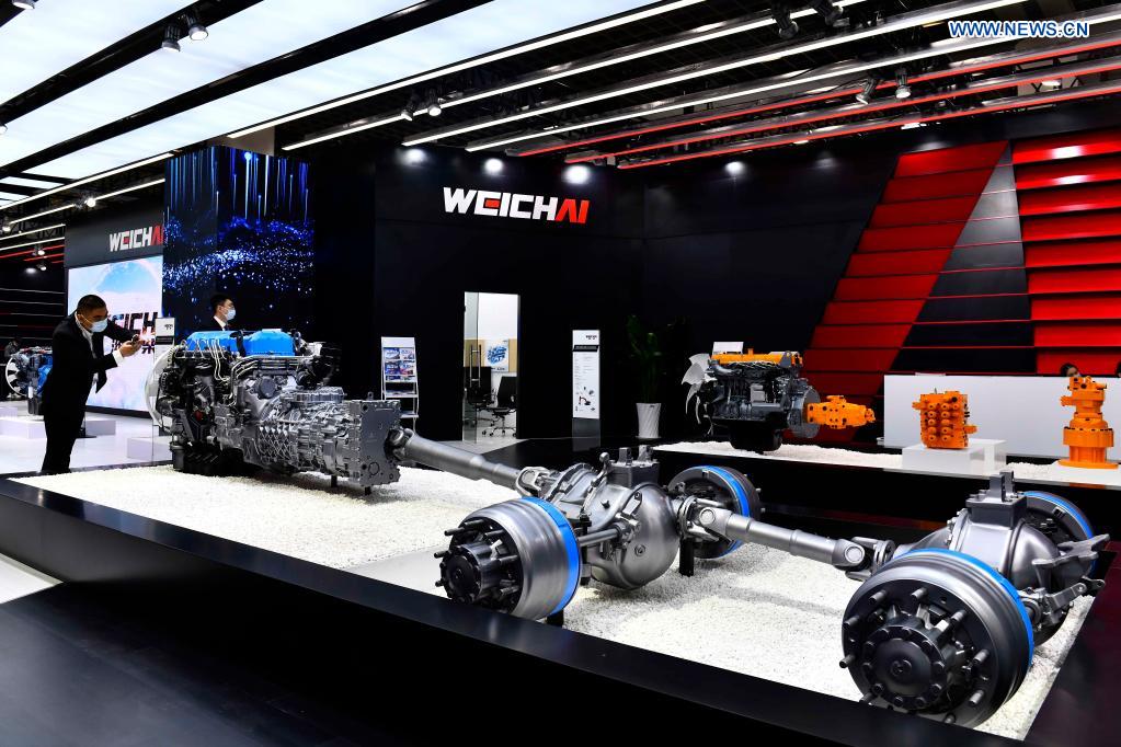 People view the engines presented by Weichai Power Co., Ltd. at the 2nd World Congress on Internal Combustion Engines in Jinan, east China's Shandong Province, April 21, 2021. The technology of producing high-end diesel engine used to be a bottleneck for China's equipment manufacturing industry. Weichai Power Co., Ltd., a state-owned enterprise founded in 1946, has developed China's first high-speed and high-power engine with completely independent intellectual property rights after more than ten years of scientific and technological research, completely ending China's long-term reliance on foreign technologies for heavy commercial vehicles. In 2018, Weichai won the first prize of the State Scientific and Technological Progress Award, and embarked on a path towards international market and high-quality development. (Xinhua/Guo Xulei)