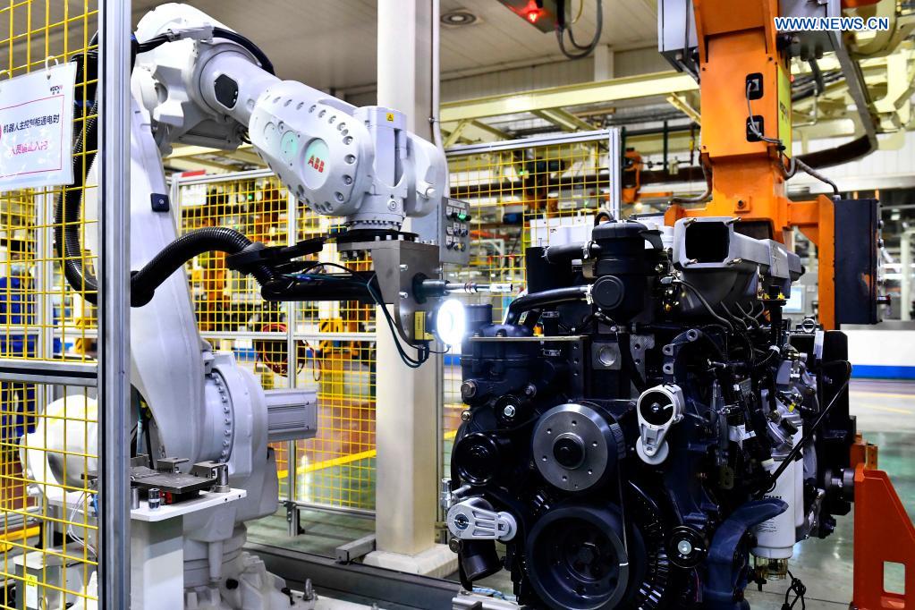 Robotic arms assemble engines on an assembly line at a workshop of the Weichai Power Co., Ltd. in Weifang City, east China's Shandong province, April 22, 2021. The technology of producing high-end diesel engine used to be a bottleneck for China's equipment manufacturing industry. Weichai Power Co., Ltd., a state-owned enterprise founded in 1946, has developed China's first high-speed and high-power engine with completely independent intellectual property rights after more than ten years of scientific and technological research, completely ending China's long-term reliance on foreign technologies for heavy commercial vehicles. In 2018, Weichai won the first prize of the State Scientific and Technological Progress Award, and embarked on a path towards international market and high-quality development. (Xinhua/Guo Xulei)