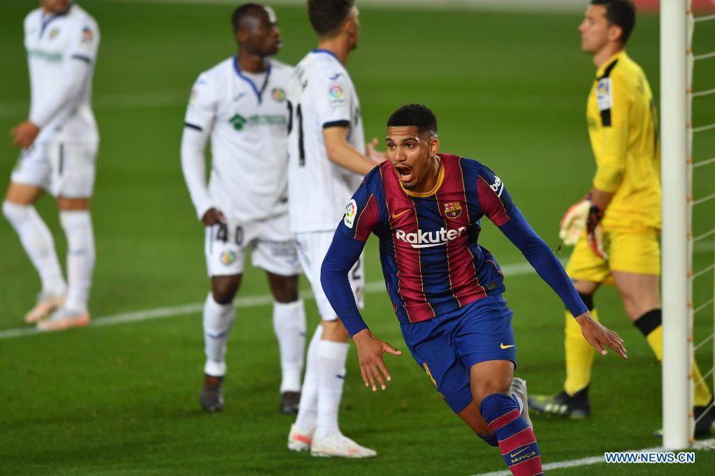 Barcelona's Ronald Araujo (front) celebrates during a Spanish football league match between FC Barcelona and Getafe CF in Barcelona, Spain, on April 22, 2021. (Photo by Joan Gosa/Xinhua)