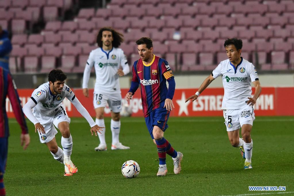 Barcelona's Lionel Messi (2nd R) competes during a Spanish football league match between FC Barcelona and Getafe CF in Barcelona, Spain, on April 22, 2021. (Photo by Joan Gosa/Xinhua)