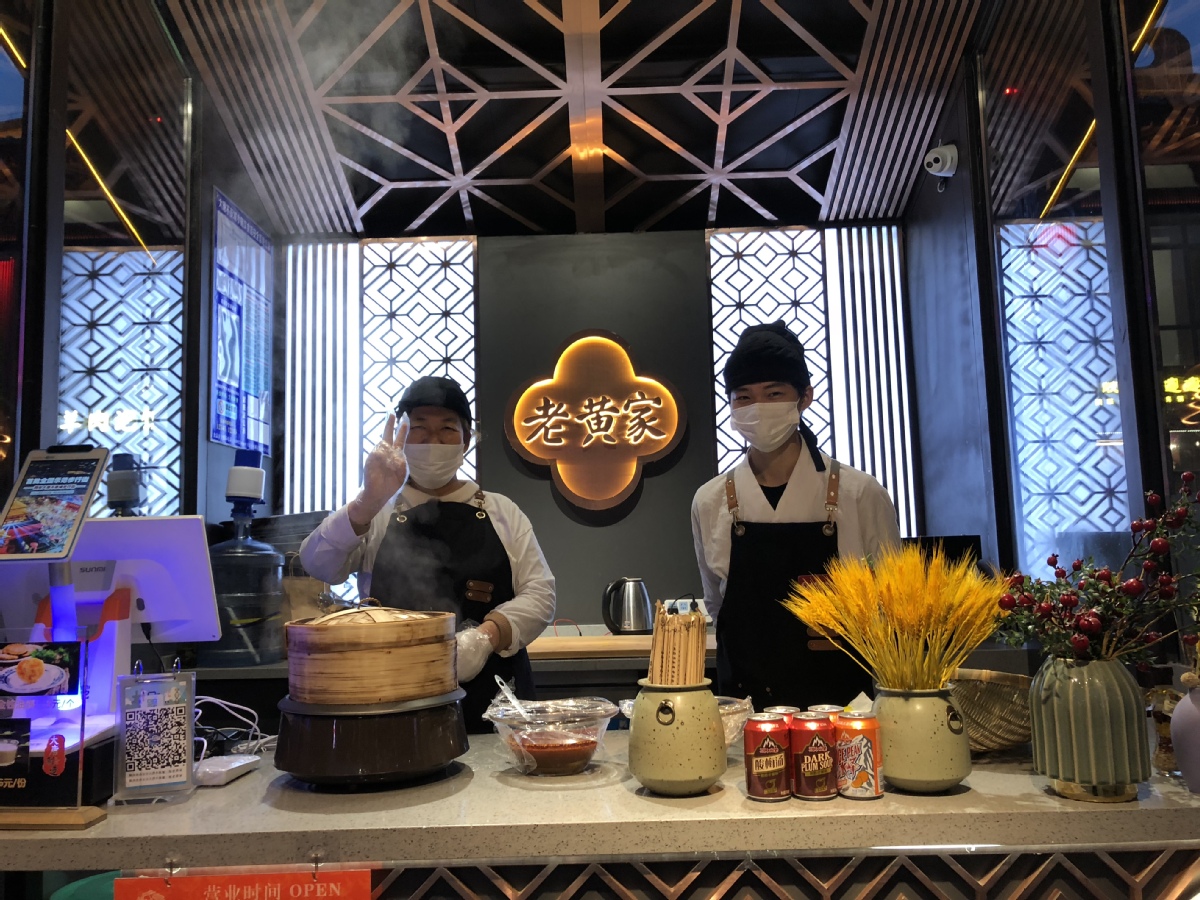 Food stall owners greet tourists at the Great Tang All Day Mall in Xi'an, Shaanxi province on April 21, 2021. [Photo by Liu Xiaozhuo/chinadaily.com.cn]