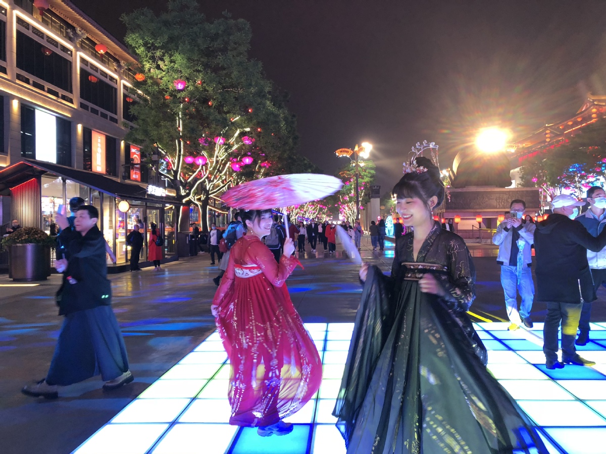 Tourists in traditional Tang Dynasty costumes enjoy themselves at the Great Tang All Day Mall in Xi'an, Shaanxi province on April 21, 2021. The mall, a sightseeing and leisure area covering 650,000 square meters south of the Big Goose Pagoda in Xi'an, features night views and light shows. The spot received 75 million visits from last April to December. [Photo by Liu Xiaozhuo/chinadaily.com.cn]