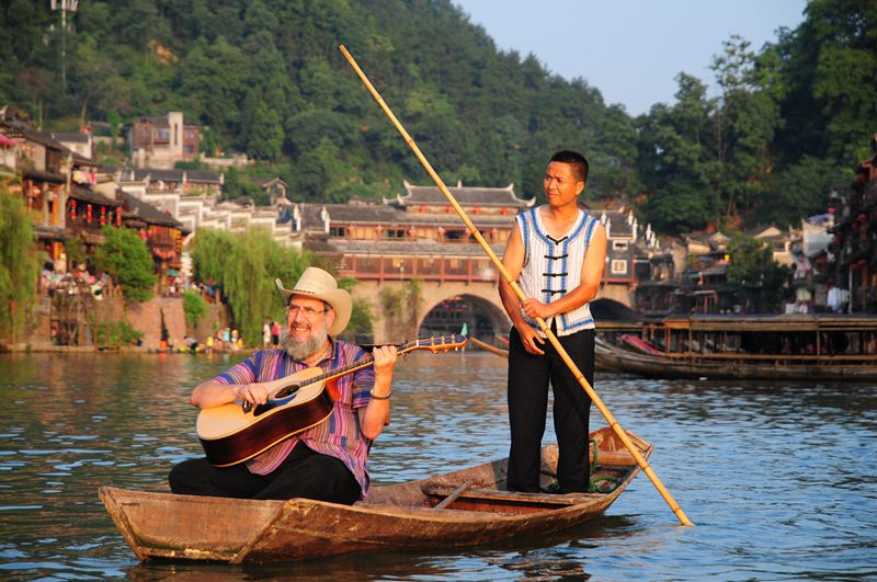 Mark Levine sits on a boat in Fenghuang Ancient Town, central China's Hunan Province. (Photo provided by Mark Levine)