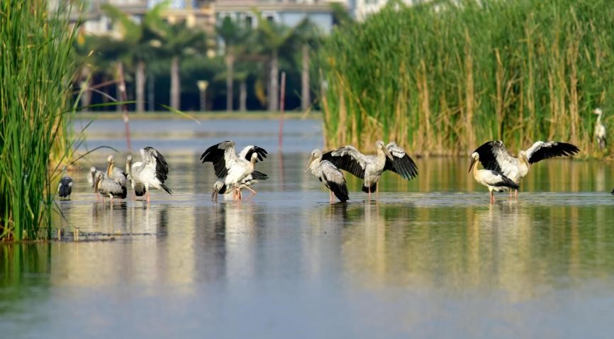 Asian openbills are playing in water at a ecological park of Mile, Honghe Hani and Yi Autonomous Prefecture, Southwest China's Yunnan Province, May 24, 2020. (Photo by Pu Jiayong/People's Daily Online)